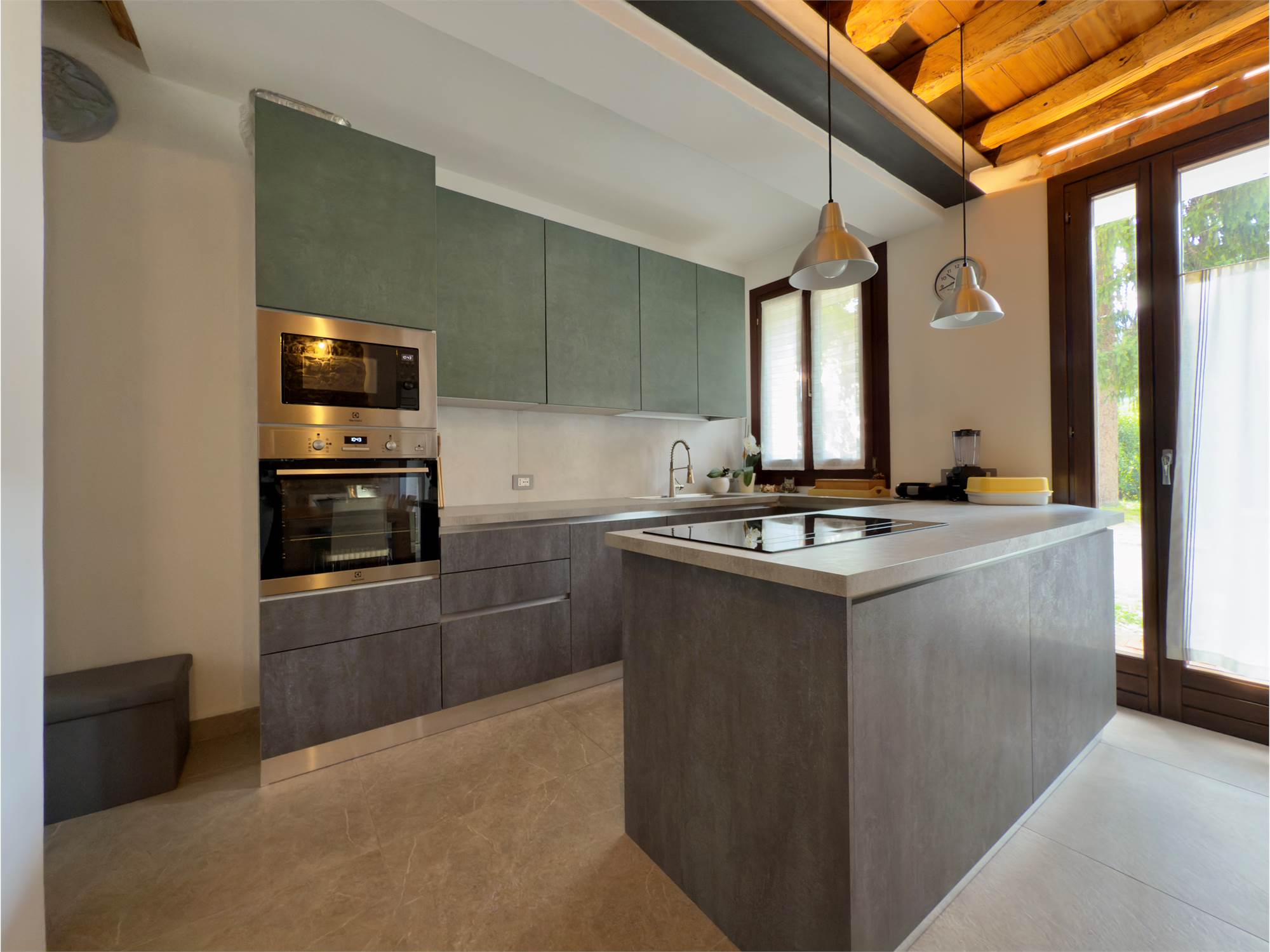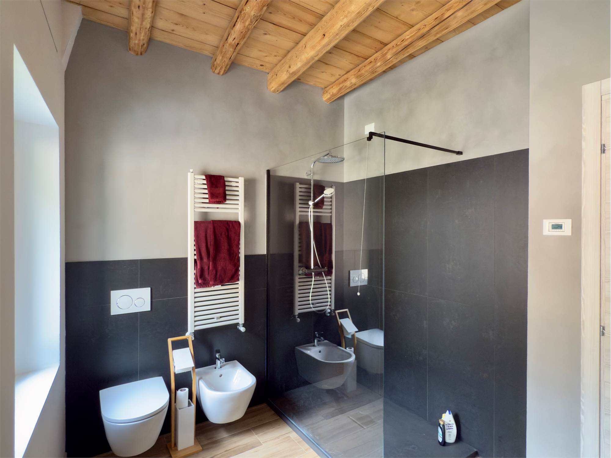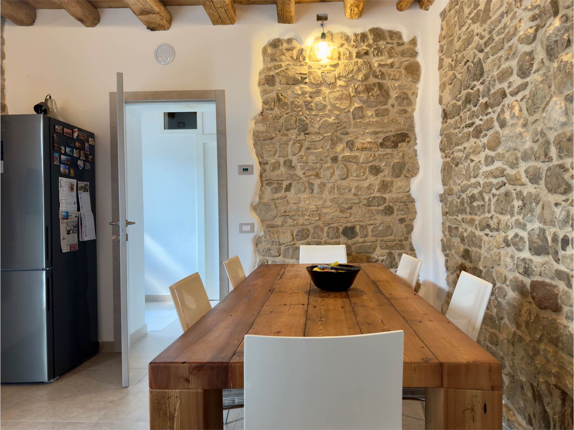 Varcando l’ingresso si viene accolti da una luminosa zona living, affiancata da un servizio di cortesia e da una cucina abitabile che diventa anche luogo piu intimo ed informale per momenti di condivisione. Qui, il design contemporaneo incontra la tradizione: la parete in pietra a vista, scaldata da una luce diffusa e accompagnata dal grande tavolo in legno, trasmette carattere e autenticità, mentre le travi originali, restaurate e lasciate naturali, dialogano con le linee pulite e moderne della cucina. L’isola centrale con piano a induzione diventa luogo di convivialità, e la pavimentazione in gres di ampio formato amplifica luce ed eleganza.
