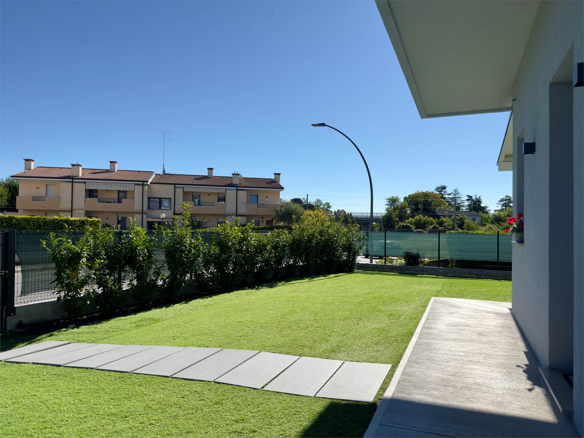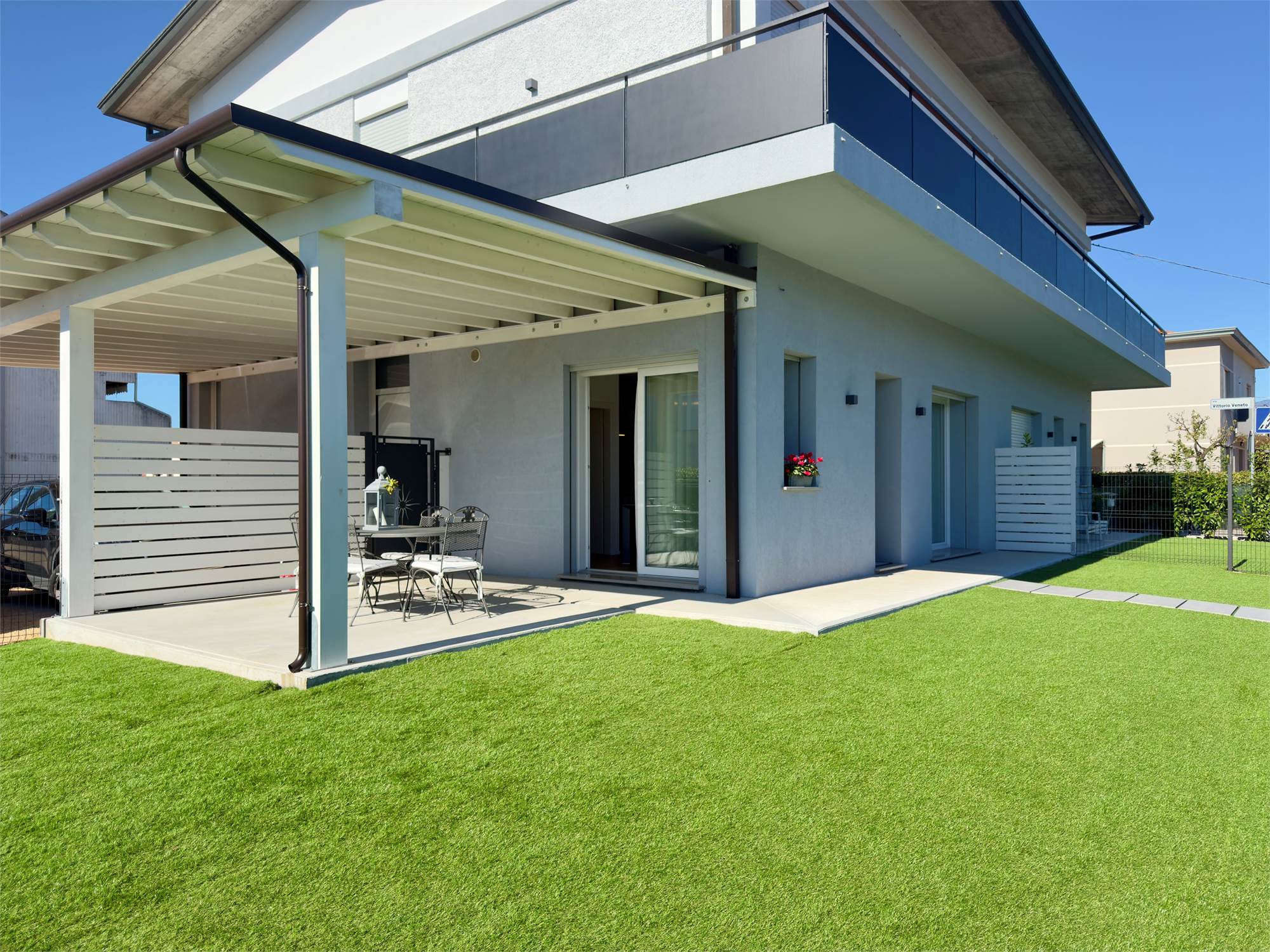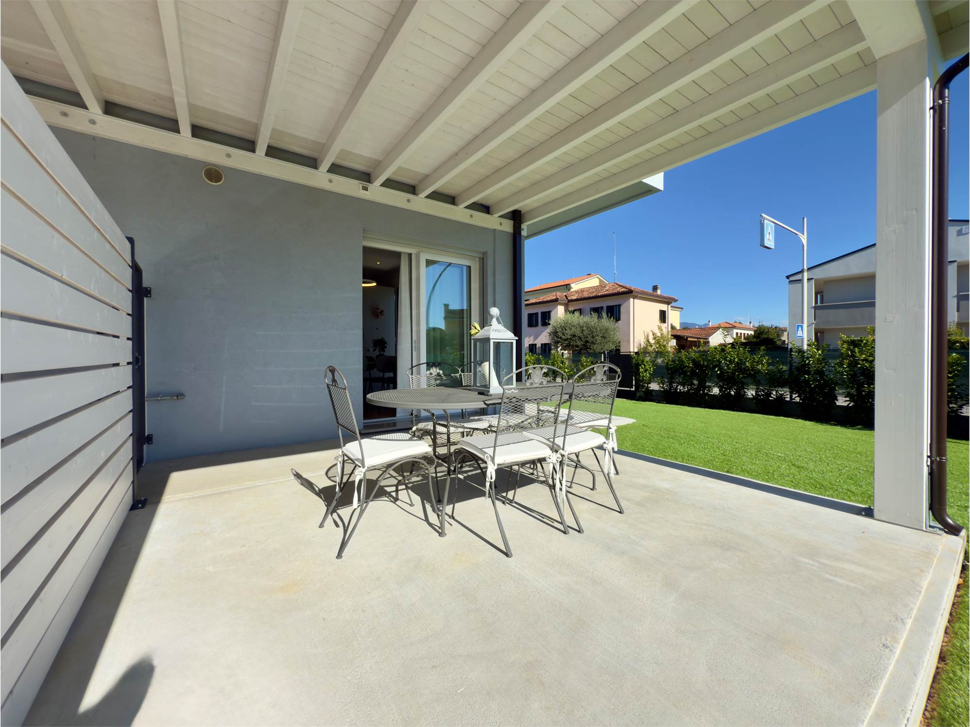 L’immobile, situato al piano terra, si apre su una zona giorno open space ampia e luminosa, grazie alle grandi vetrate che garantiscono un’eccellente illuminazione naturale e un piacevole affaccio sul giardino privato. Quest’ultimo è impreziosito da una pompeiana ideale per pranzi e cene all’aperto.