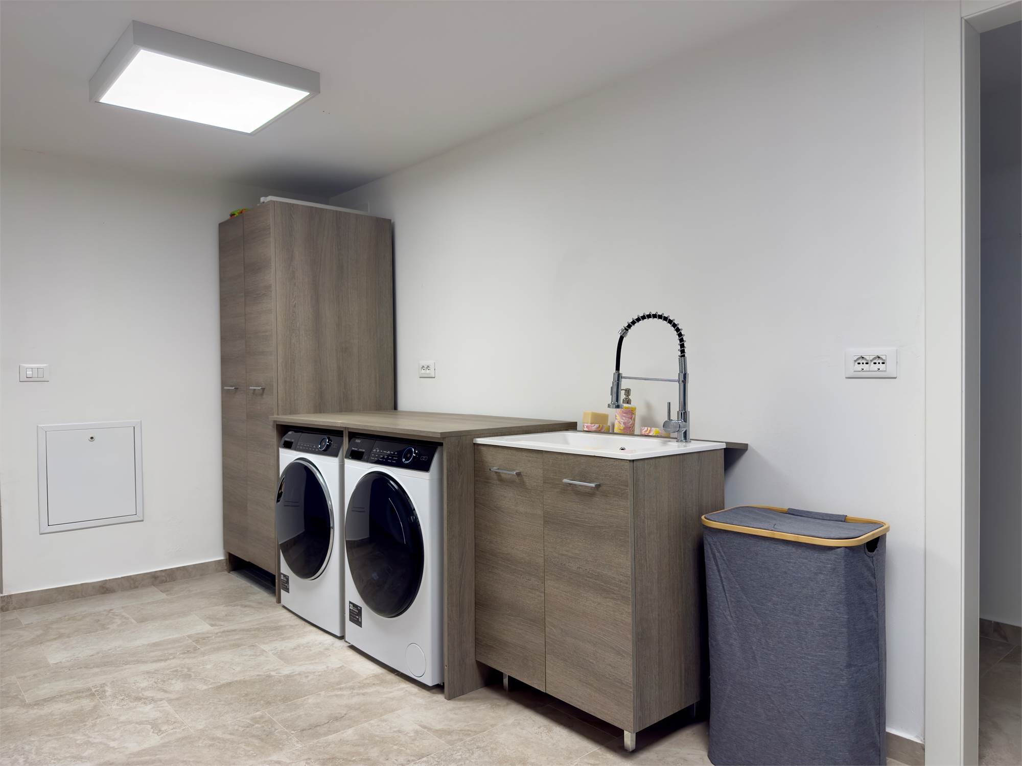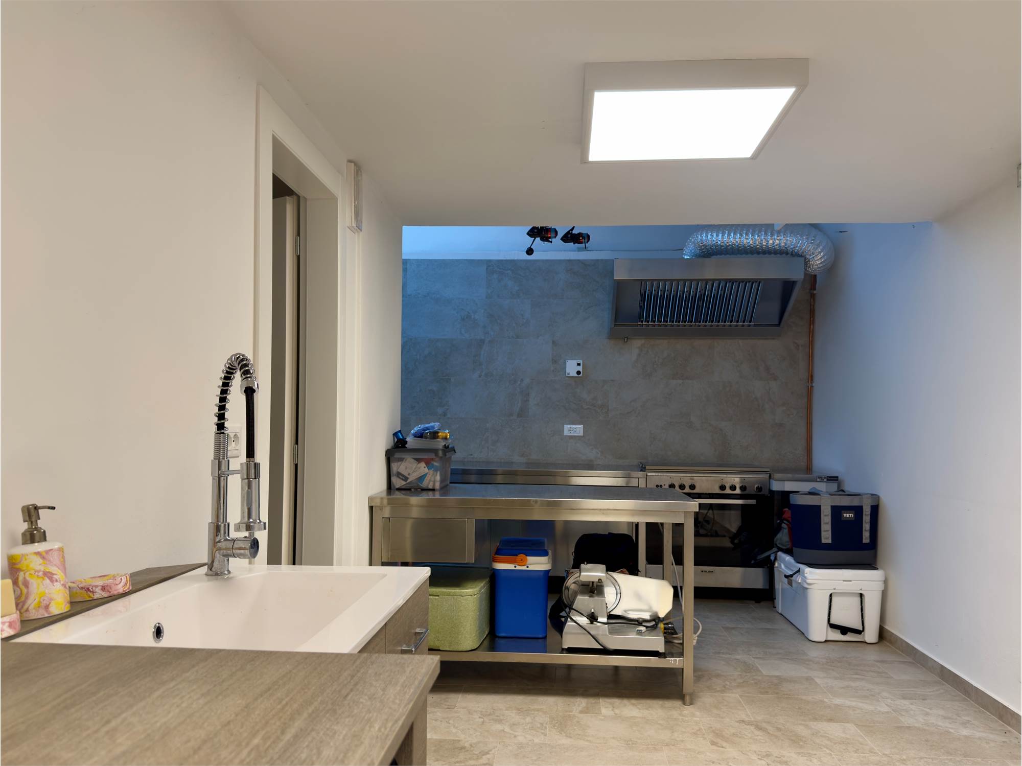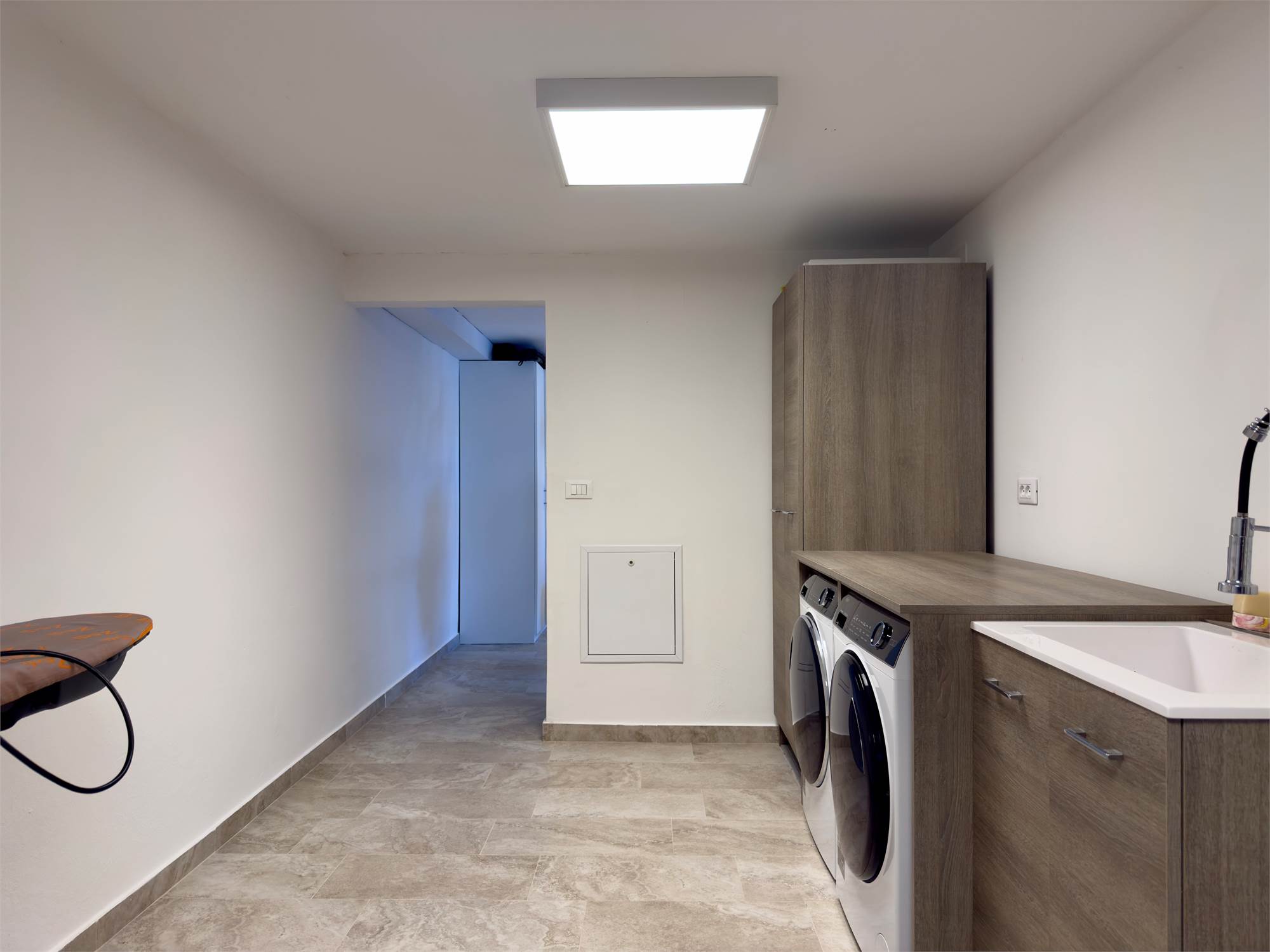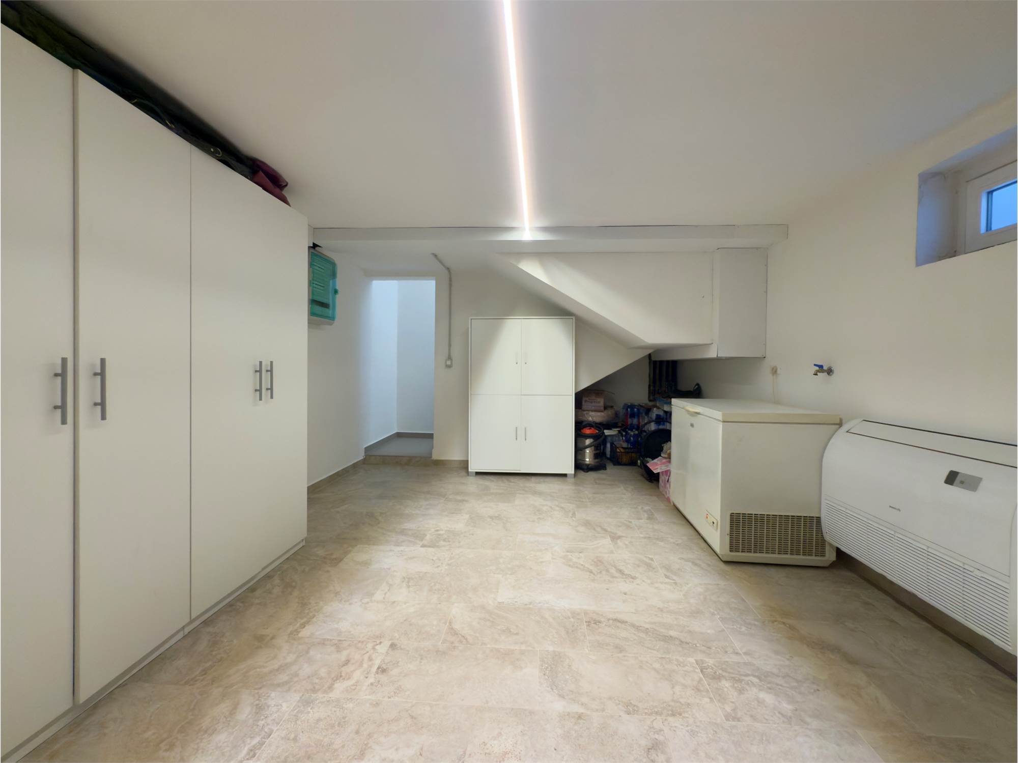 Al piano interrato si trova un ambiente versatile, completamente riscaldato, utilizzabile come locale di servizio, sala hobby o lavanderia, completo di cucina attrezzata e secondo bagno con doccia.