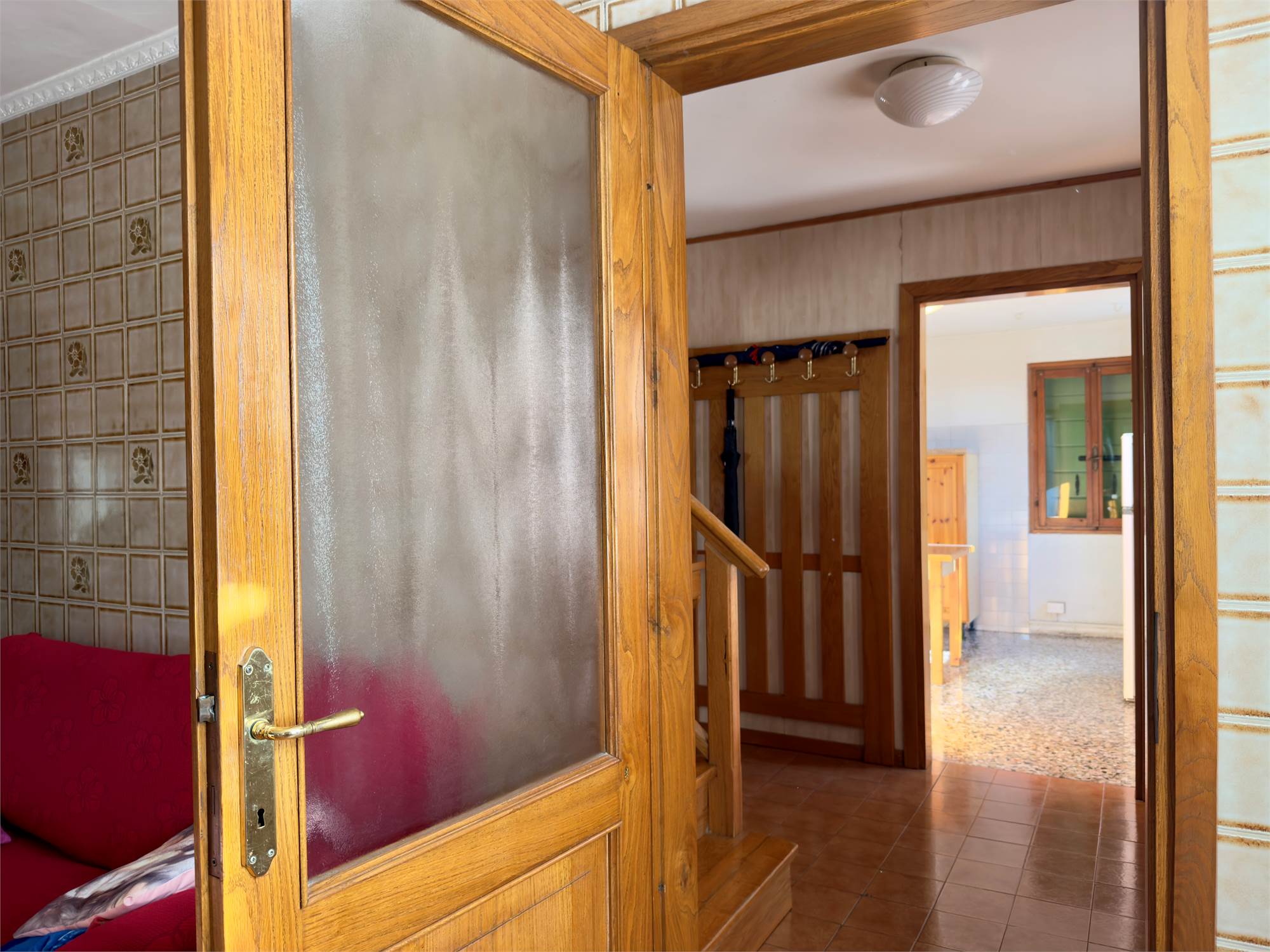 L’ingresso si apre su una disposizione interna equilibrata e funzionale: sulla destra il luminoso salotto, ambiente caldo e accogliente, collegato direttamente al primo bagno; sulla sinistra la cucina, spaziosa e ben organizzata, perfetta per chi ama la convivialità.